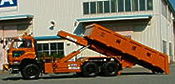 製鉄所の構内物流システムとして評価の高いコンテナ脱着・分離型機をベースに、荷崩れ防止・積載量アップとよりスピーディーなコンテナ脱着を図る為に開発されたコンテナ水平脱着式トラックです。